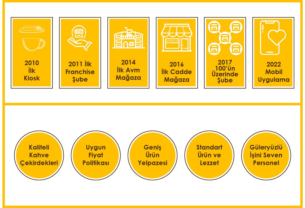 Türk kültürünün vazgeçilmezi olan Türk kahvesi lezzetini, kaliteli kahve çekirdekleri ile yerinde taze öğüterek ve uygun fiyat politikası ile alışveriş merkezlerine, caddelere taşımak ve kolay ulaşılabilir kiosklarla take away bardaklarda misafirlerimize sunup yeni neslin sevgisini kazandırmak oldu. Yakaladığımız başarıyı her geçen gün arttırmak ve herkese ulaşılır olmak adına şubeleşme yoluna girdik ve 2011'de ilk franchise şubemizi, 2014'te ilk yurtdışı franchise şubemizi açtık.